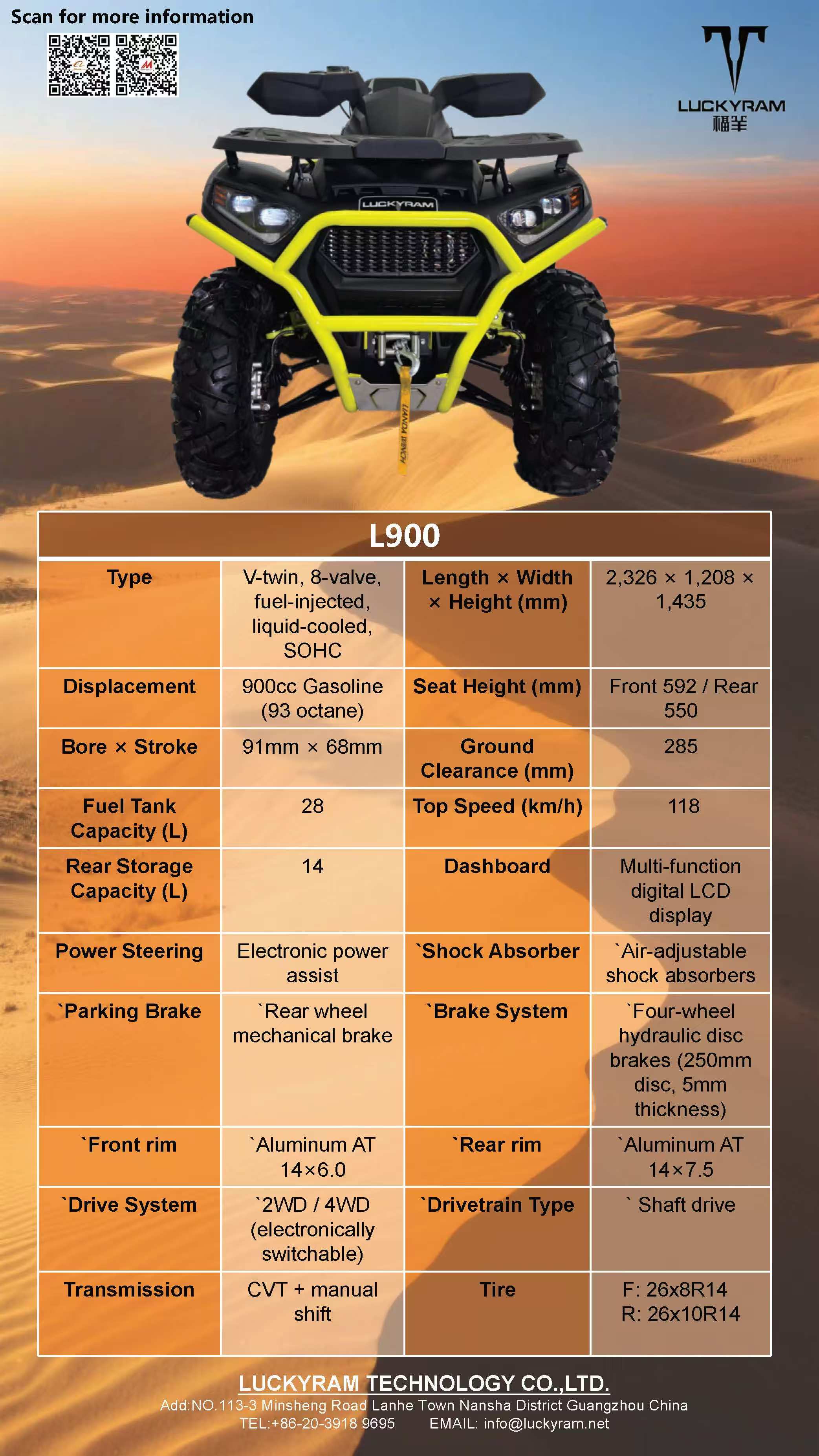 Ισχυρό κινητήρα-Εξοπλισμένος με υψηλής απόδοσης κινητήρα 4-Stroke, παρέχοντας ισχυρή ροπή και επιτάχυνση για τις περιπέτειες εκτός δρόμου. Η ανάρτηση και η ανάρτηση των επιπτώσεων-διαθέτουν ανεξάρτητα συστήματα εναιωρήματος 2WD/4WD Modes έλξη σε λάσπη, άμμο και βραχώδη μονοπάτια Τα δίσκους φρένα (μπροστά και πίσω) εξασφαλίζουν γρήγορες, ασφαλείς στάσεις ακόμη και σε υψηλές ταχύτητες. Εφαρμογές του 900cc ATV: Off-road Recreation-Ιδανικό για οδήγηση μονοπατιών, Dune Bashing και High Potore forting for the Perfect Landscapes. Αξιόπιστη απόδοση σε απομακρυσμένο ή δύσκολο έδαφος για αποστολές έκτακτης ανάγκης.